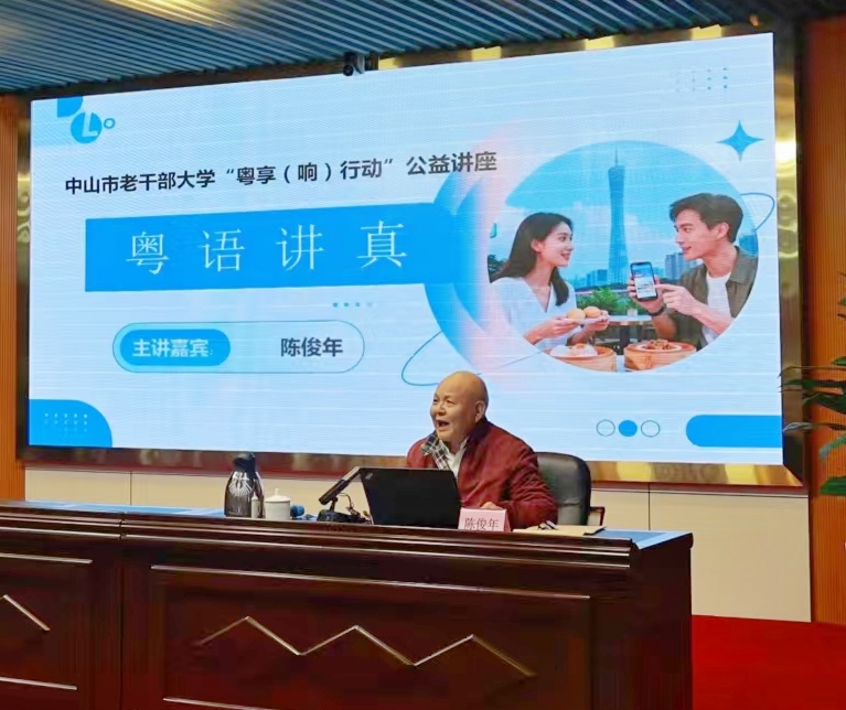 岭南文化源远流长,粤语传承古韵今声。为传承弘扬岭南文化,丰富课程体系、提升文化品位,12月9日,中山市老干部大学举行客座教授聘任仪式暨“粤语讲真”专题讲座,聘请著名作家、编审、享受国务院政府特殊津贴专家、广东省新闻出版局原局长陈俊年为客座教授并邀请陈俊年举办“粤语讲真”专题讲座。市政协原副主席、市老干部大学校长刘传沛,著名作家、原市文广新局局长郑集思等出席活动。市老干部大学“传承粤语弘扬岭南文化”形象大使及粤语导师团成员、大学学员及粤语爱好者共200多人参加活动。